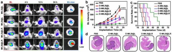 研究者選用金屬有機框架材料(MOFs)作為納米骨架,通過精細(xì)地結(jié)構(gòu)調(diào)控實現(xiàn)了對狂犬病毒獨特的子彈狀形貌和尺寸的模擬;同時在其表面修飾了嗜神經(jīng)性多肽RVG29的脂雙層作為人造病毒外殼來模仿狂犬病毒的侵染性表面,最終構(gòu)建出“形神兼?zhèn)洹?/span>的仿生納米藥物。研究者進一步對狂犬病毒形貌仿生與功能仿生的二元獨立性和協(xié)同性進行了系統(tǒng)研究,結(jié)果表明:與單一的功能仿生或形貌仿生的納米藥物相比,“形神兼?zhèn)?/span>”的協(xié)同仿生納米藥物的腦膠質(zhì)瘤遞送效率可提高3倍以上,高效還原了狂犬病毒特異性入侵中樞神經(jīng)系統(tǒng)的性能,最終有效地改善治療藥物無法有效地穿越BBB到達(dá)癌變部位的窘境,顯著提高藥物的治療效率。值得期待的是,作為一個可以高效穿越BBB的納米遞送平臺,這種“形神兼?zhèn)洹?/span>的仿生納米遞藥系統(tǒng)有望延伸到其他中樞系統(tǒng)類疾病的治療中,應(yīng)用前景廣泛。